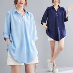 Real shot of new summer loose large size casual style linen slimming belly-covering collar shirt top